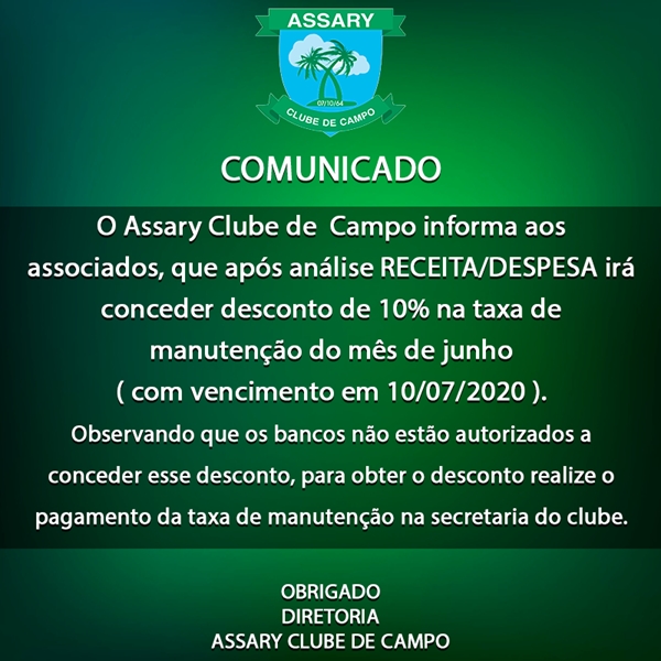 O Assary Clube de Campo informa aos associados, que após análise RECEITA/DESPESA irá conceder desconto de 10% na taxa de manutenção do mês de junho ( com vencimento em 10/07/2020 ).