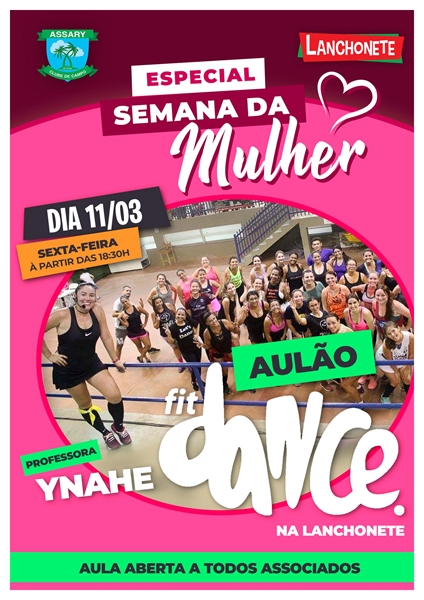 E nessa sexta, dia 11 de Março, à partir das 18:30h, tem um AULÃO DE FIT DANCE na Lanchonete Assary com a professora YNAHE.