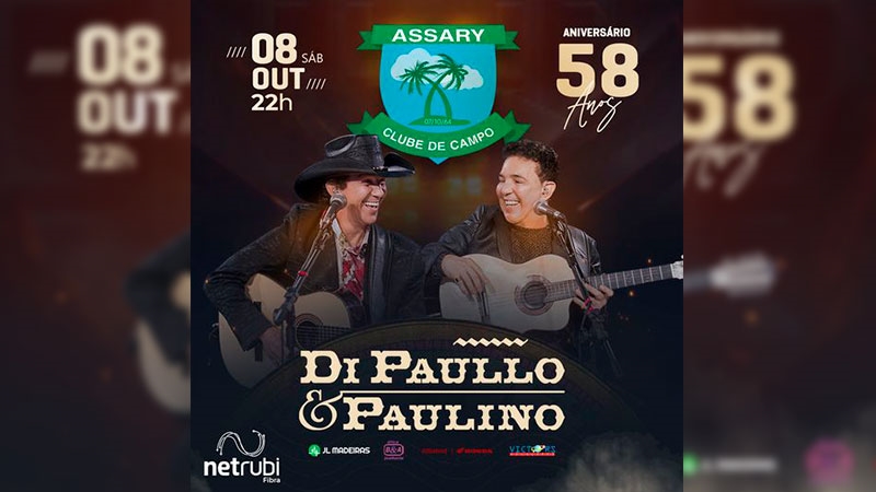 No dia 8 de outubro, a consagrada dupla sertaneja, Di Paullo & Paulino, irá subir ao palco do Centro de Eventos acompanhada de outras atrações, que ainda serão anunciadas nos próximos dias.