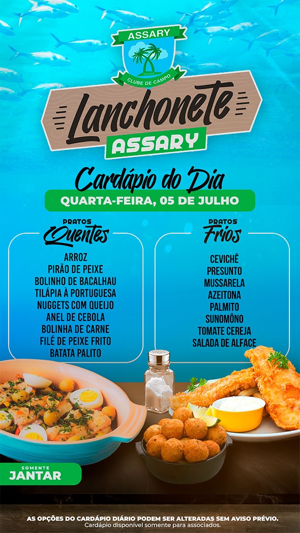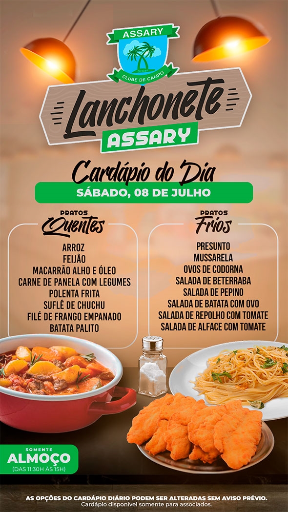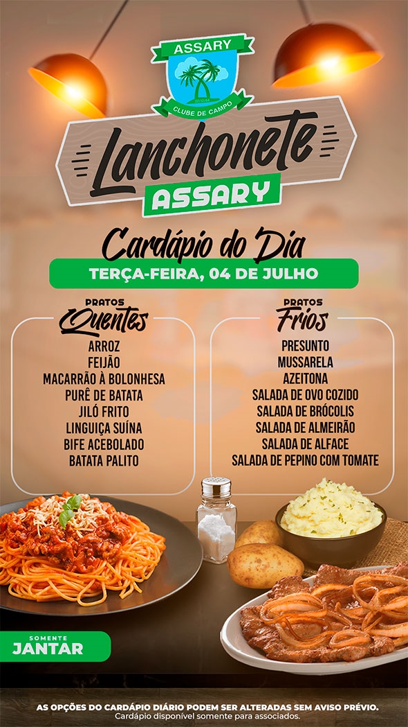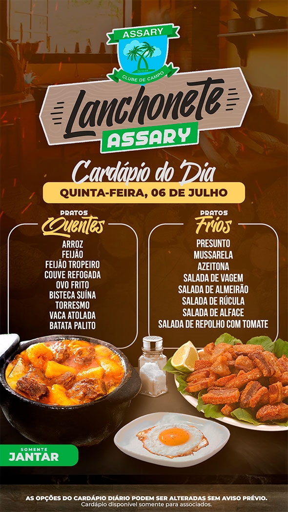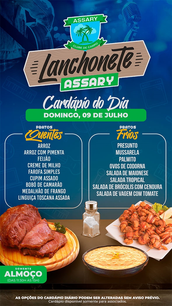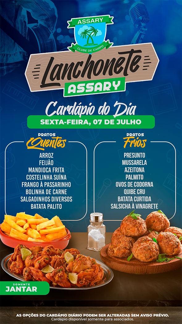 Informamos que as opções do cardápio podem sofrer alterações sem aviso prévio, visando sempre oferecer o melhor para nossos associados."
