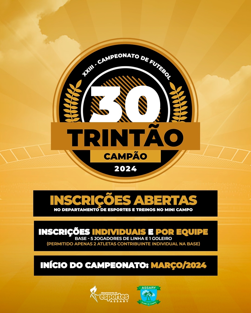Estão abertas as inscrições para o XXIII CAMPEONATO DE FUTEBOL TRINTÃO 2024.