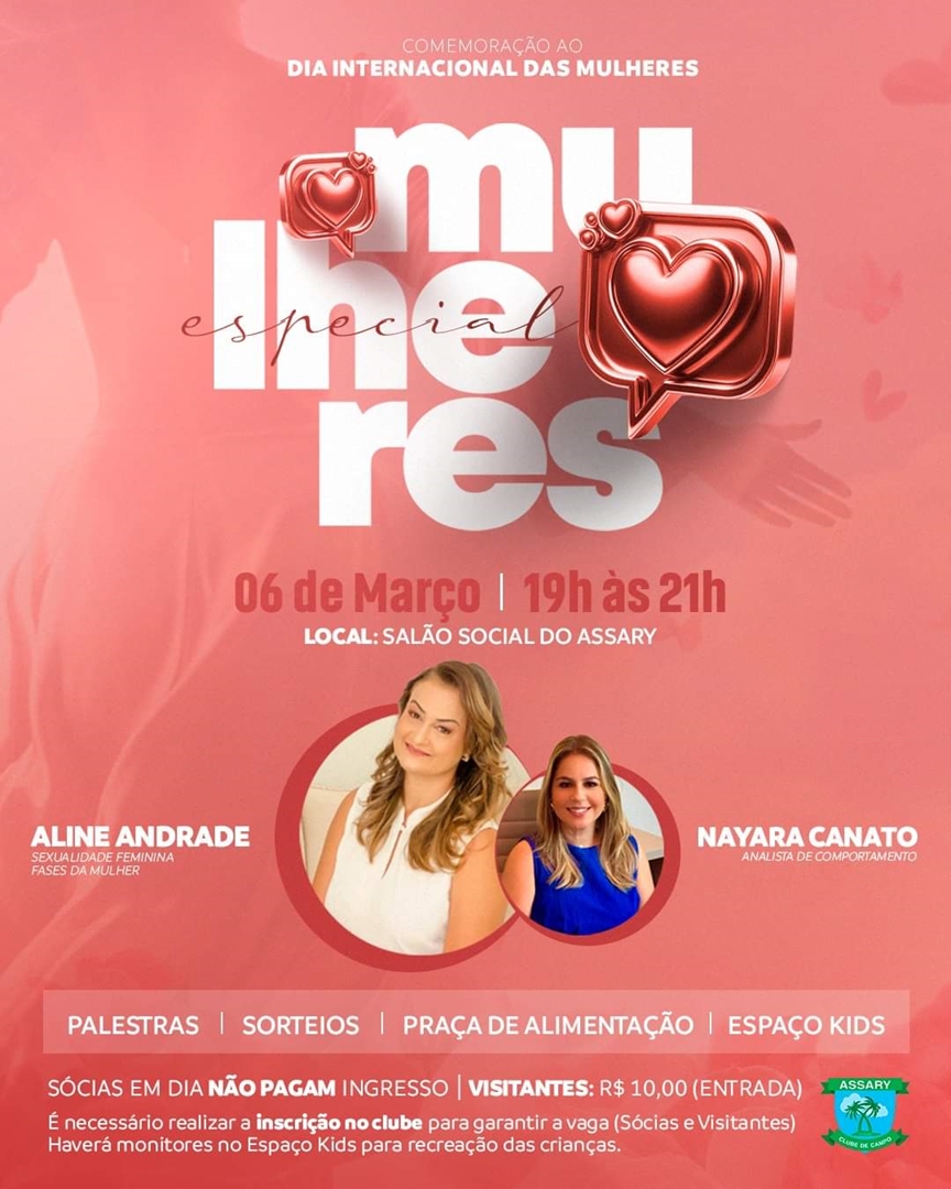 Para comemorar o dia delas, o Assary Clube de Campo, dia 06 de março, a partir das 19h, realizará um super bate-papo com duas grandes figuras femininas: Aline Andrade e Nayara Canato, falando sobre diversos assuntos femininos, sexualidade, comportamento, fases da mulher e muito mais.