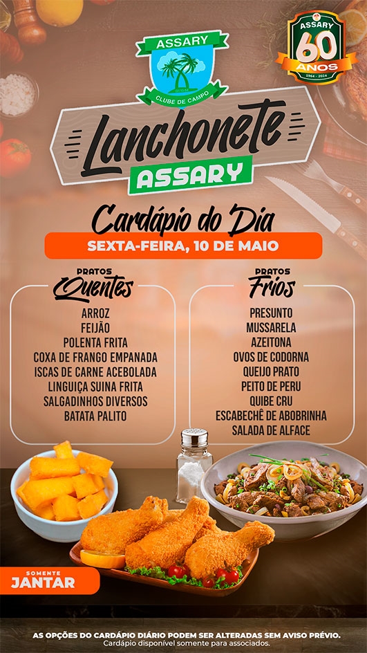 O Jantar está disponível a partir das 18:00h e caso deseje, pode estar levando e comendo no conforto de sua casa, lembrando que o atendimento acontece até as 22:00h, nos vemos lá!