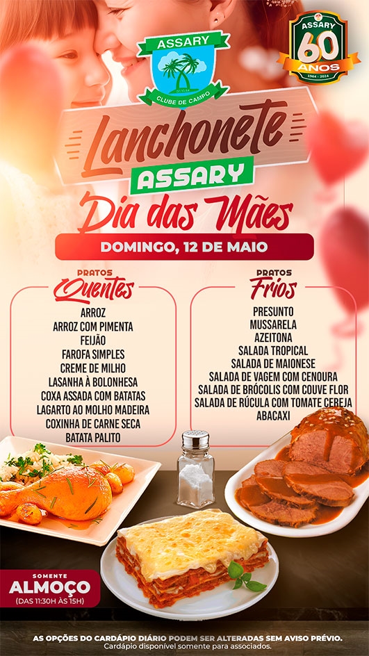 Um cardápio ESPECIAL de pratos quentes para você curtir com sua família, e também uma mesa de frios e saladas.