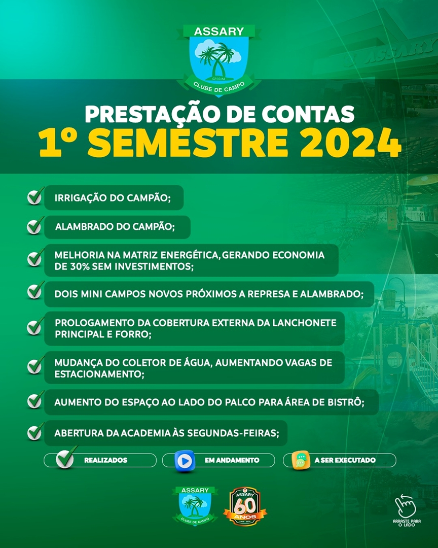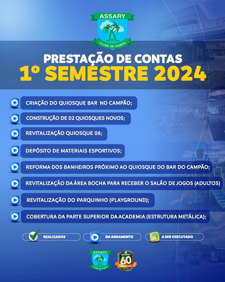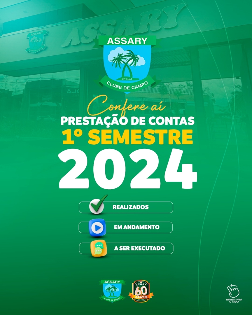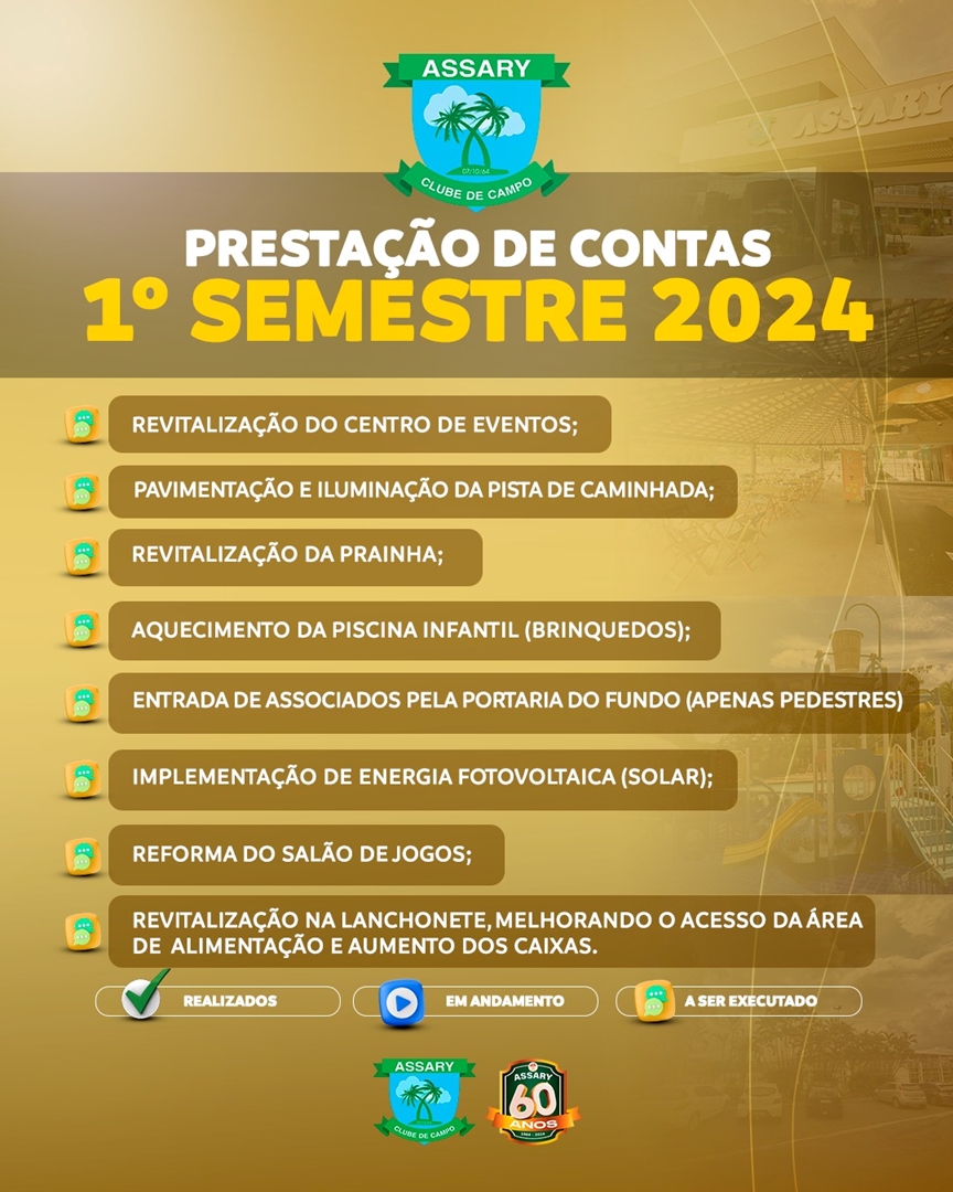 Atenção associados, fiquem ligados em tudo que aconteceu no primeiro semestre de 2024 em nosso clube, todas as melhorias, mudanças, reformas e também tudo que estará chegando em breve para melhor atender a todos.
