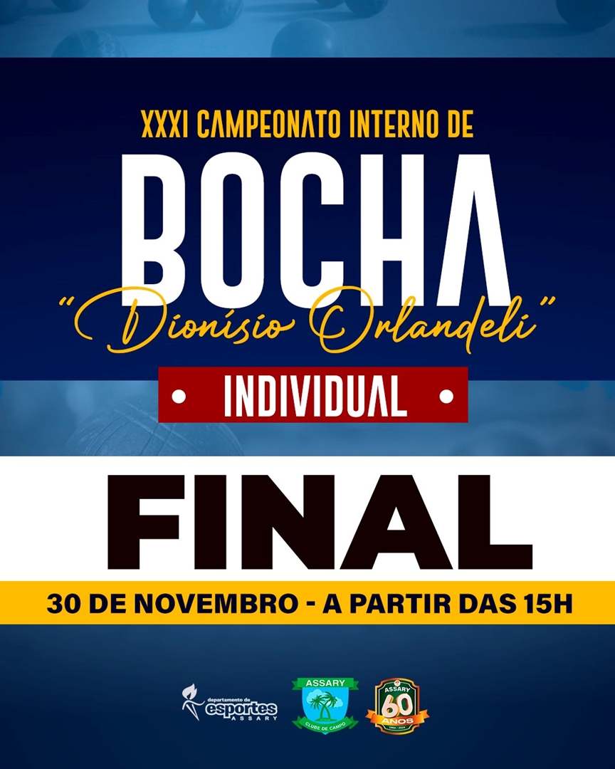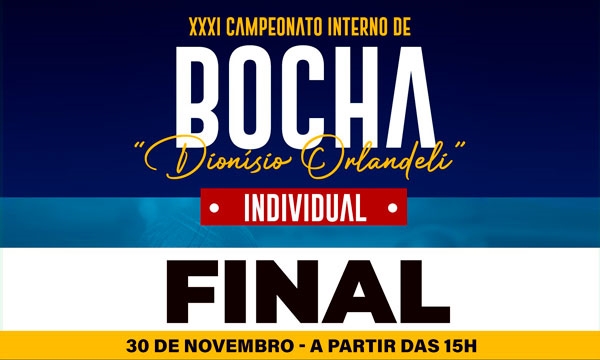 Neste sábado, 30 de novembro, a partir das 15h, acontece a Final do XXXI Campeonato Interno de Bocha Individual "Dionísio Orlandeli" 2024.