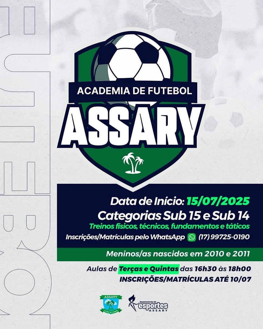 A partir do dia 15 de julho, o Departamento de Esportes do Assary dá o pontapé inicial na Academia de Futebol Assary, com treinos voltados para as categorias Sub-14 e Sub-15 (meninos e meninas nascidos em 2010 e 2011).